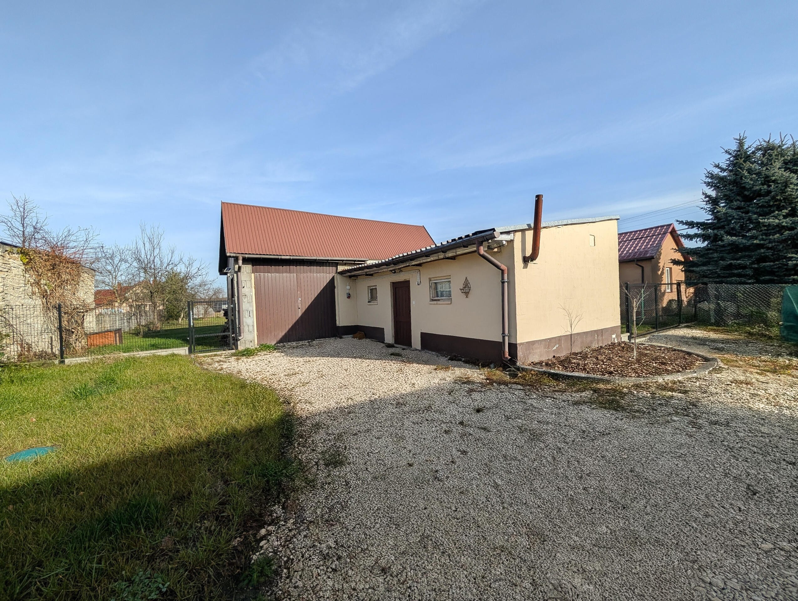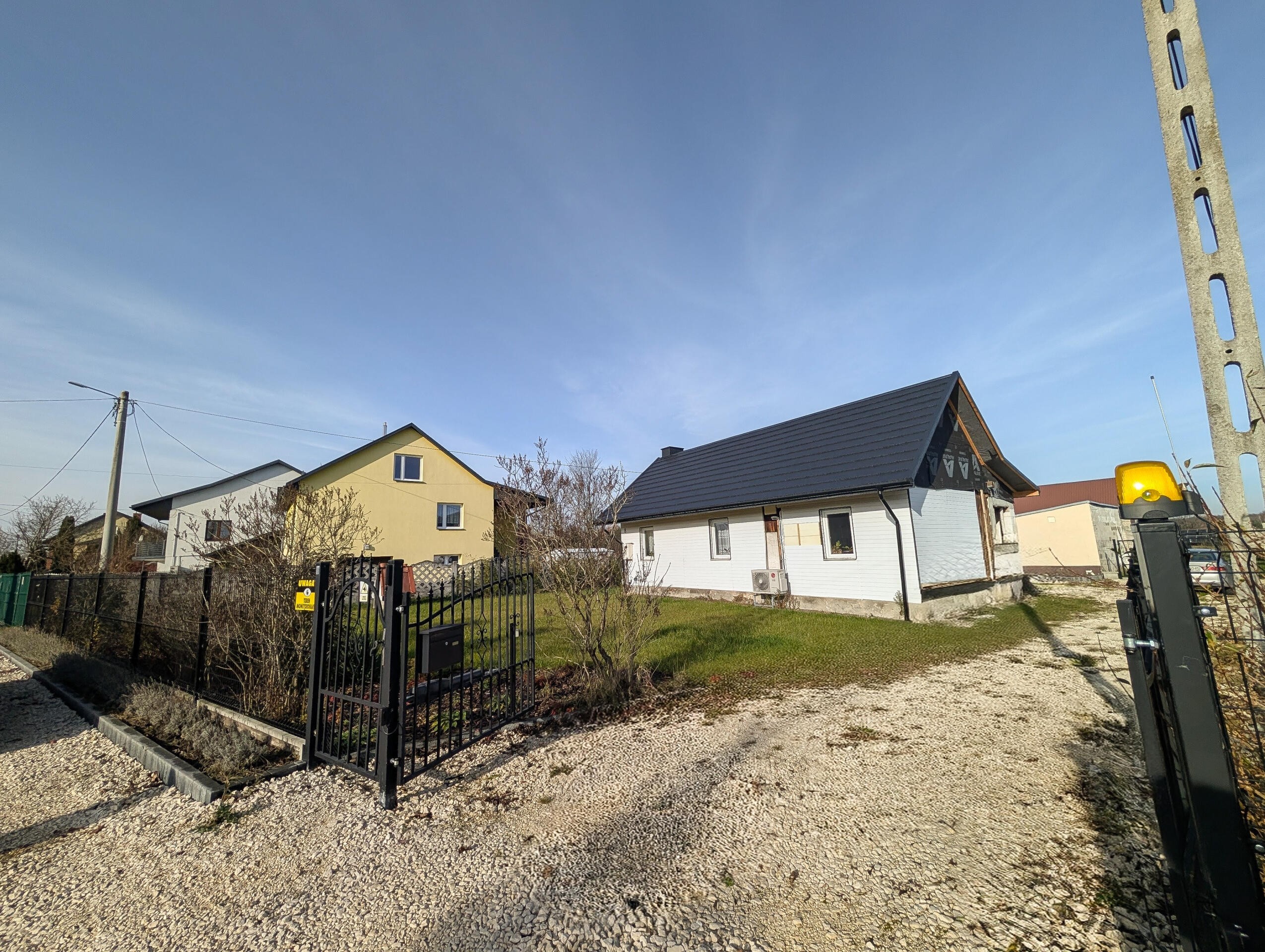 Dojazd drogą asfaltową. Działka ogrodzona i zagospodarowana. Brama wjazdowa automatyczna. Dodatkowe bramy przejazdowe do tylnej działki.