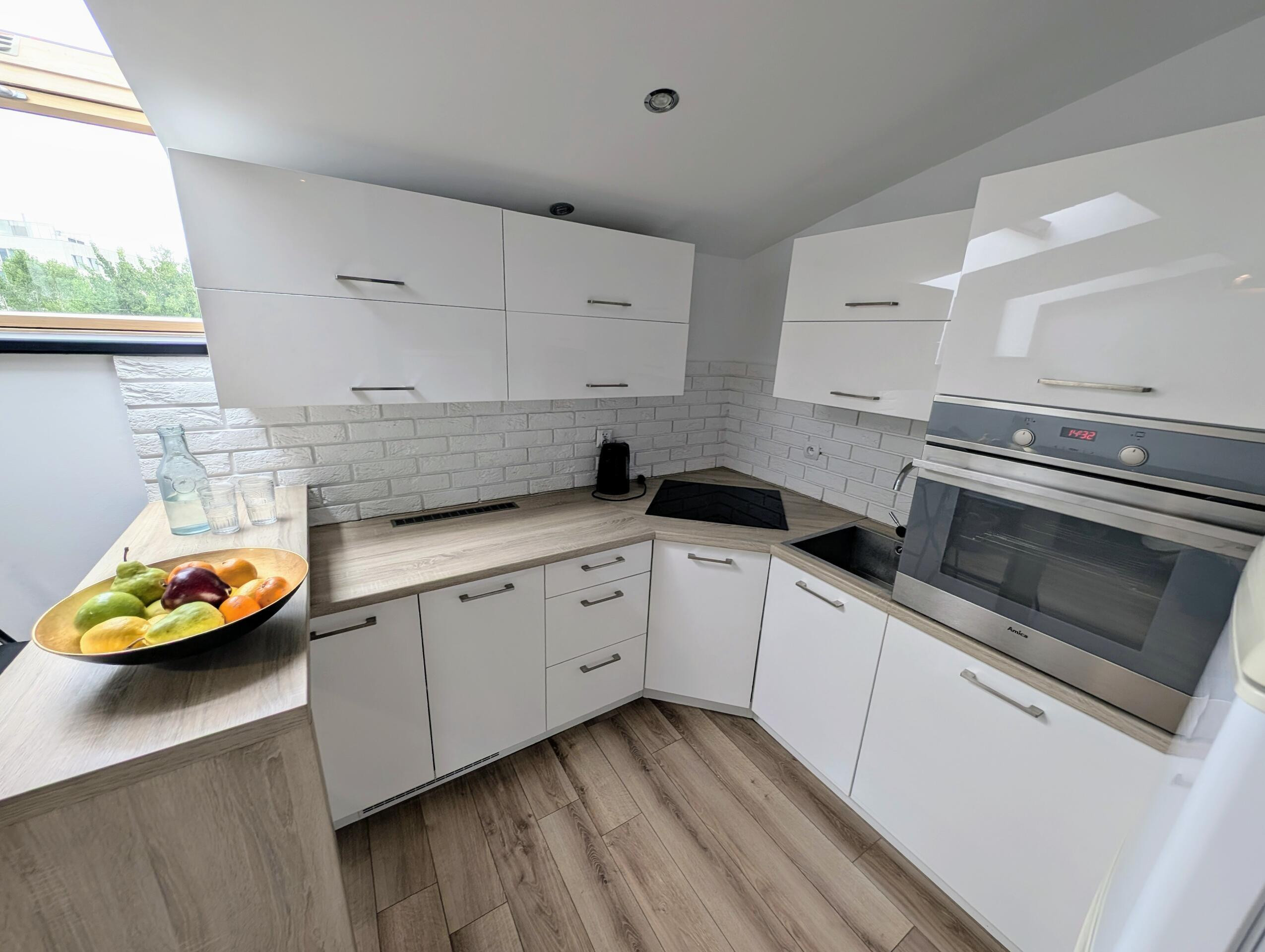 Aneks kuchenny z: płytą indukcyjną, zmywarką, piekarnikiem, lodówką, mikrofalówką