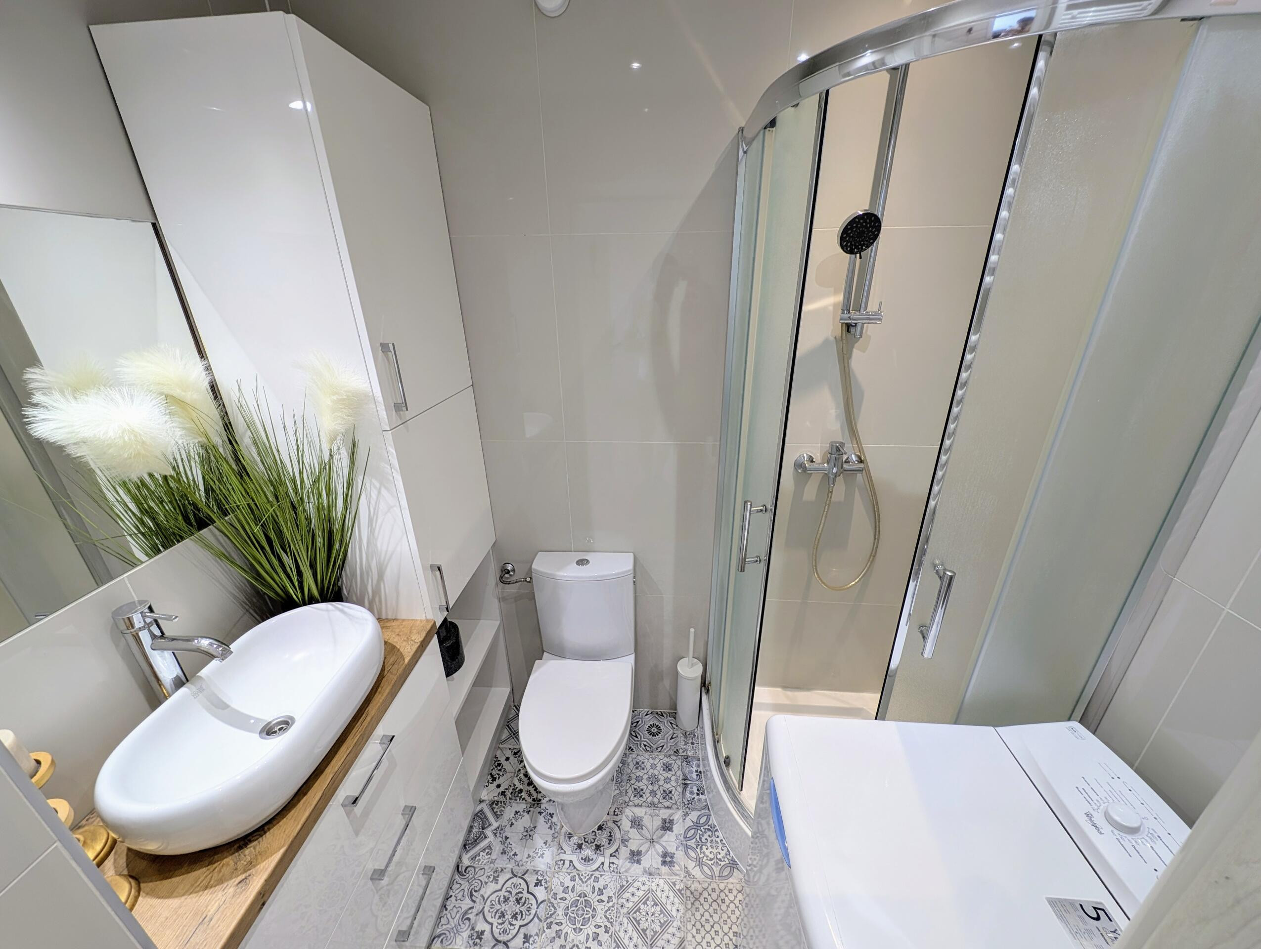 Łazienka z kabiną prysznicową i pralką
