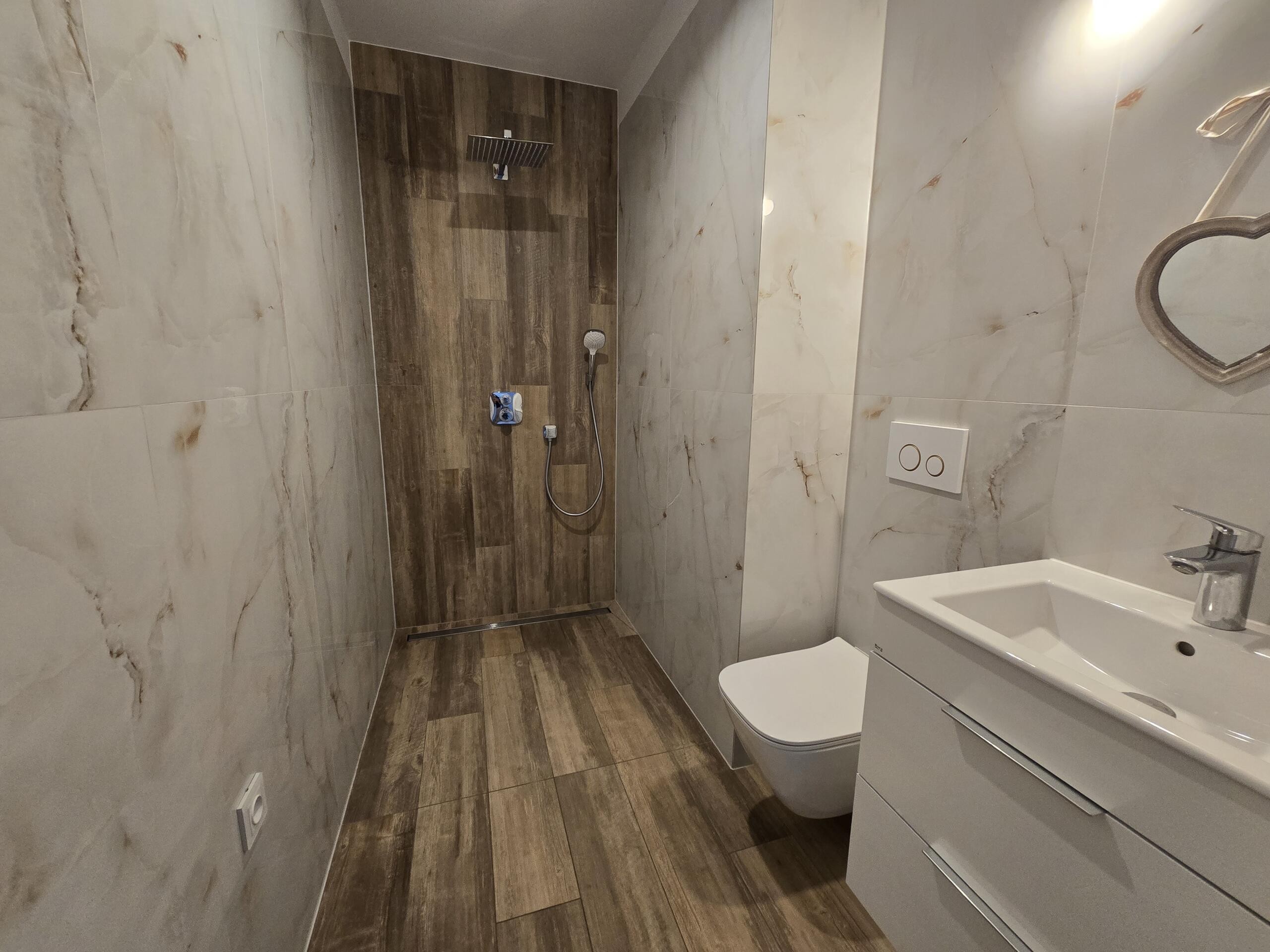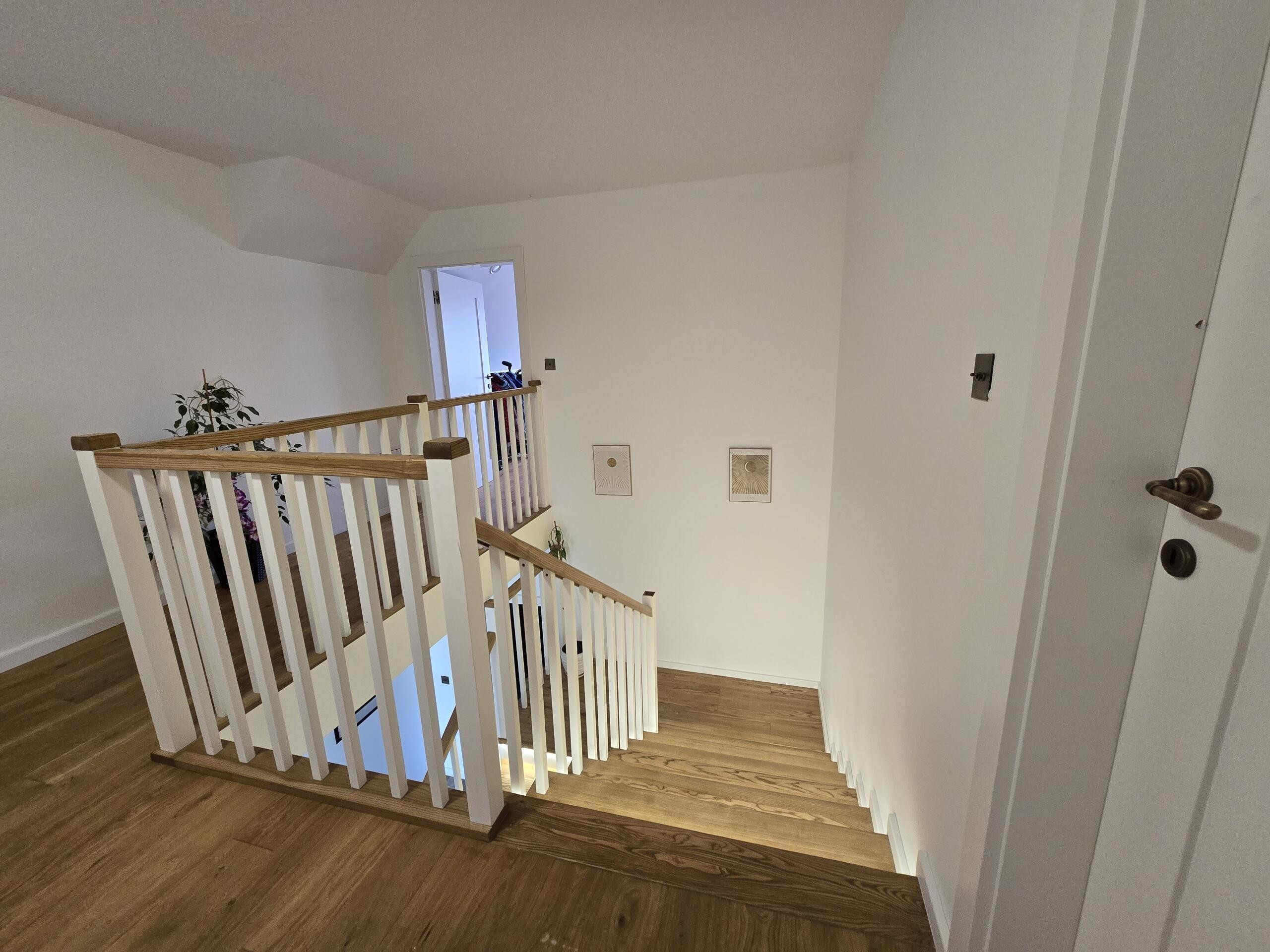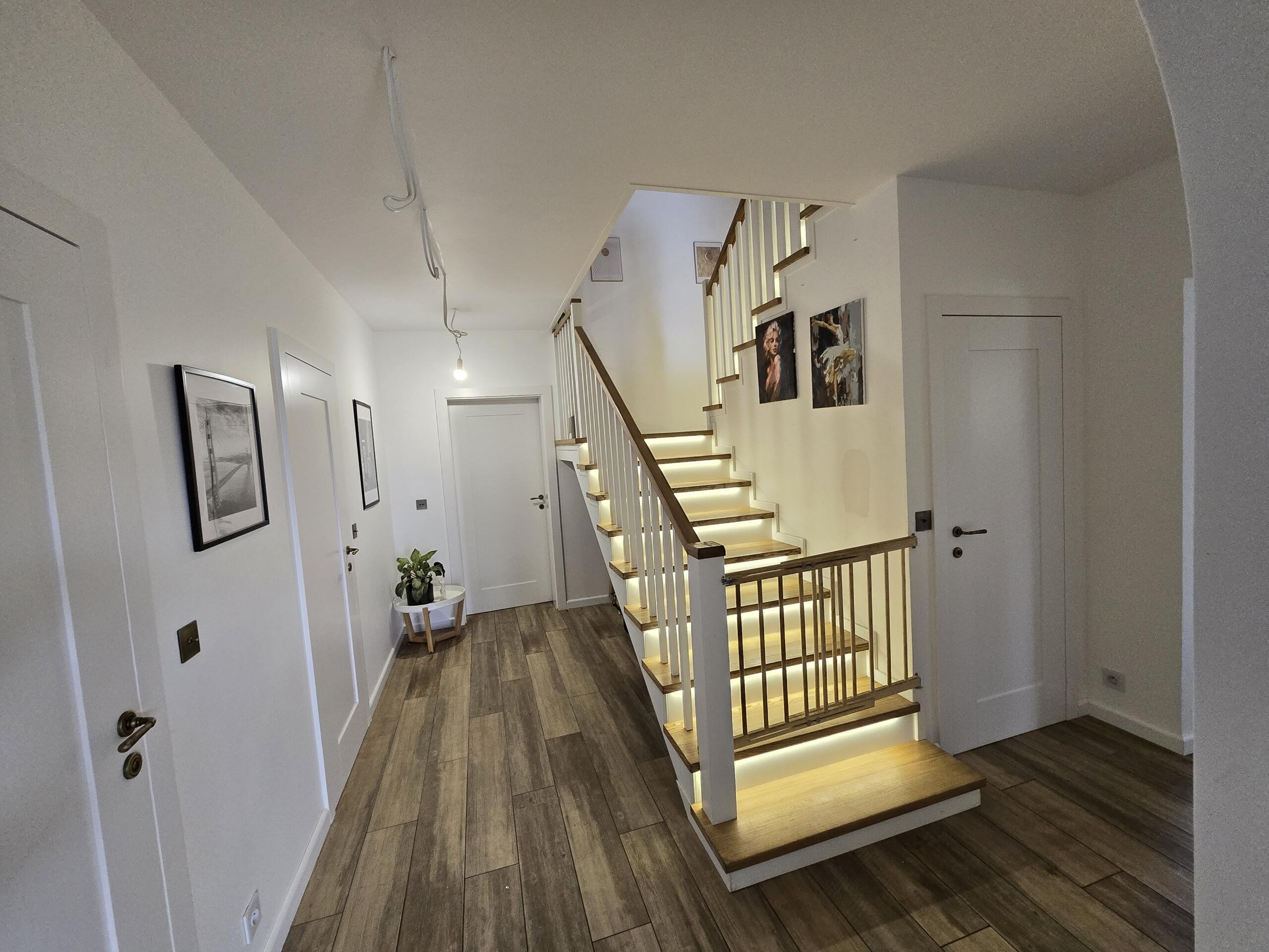 * Włoski gres na parterze naturalne drewno – schody jesionowe oraz podłogi z deski dębowej wysokiej jakości stolarka drzwiowa (Asilo) bezprogowe,